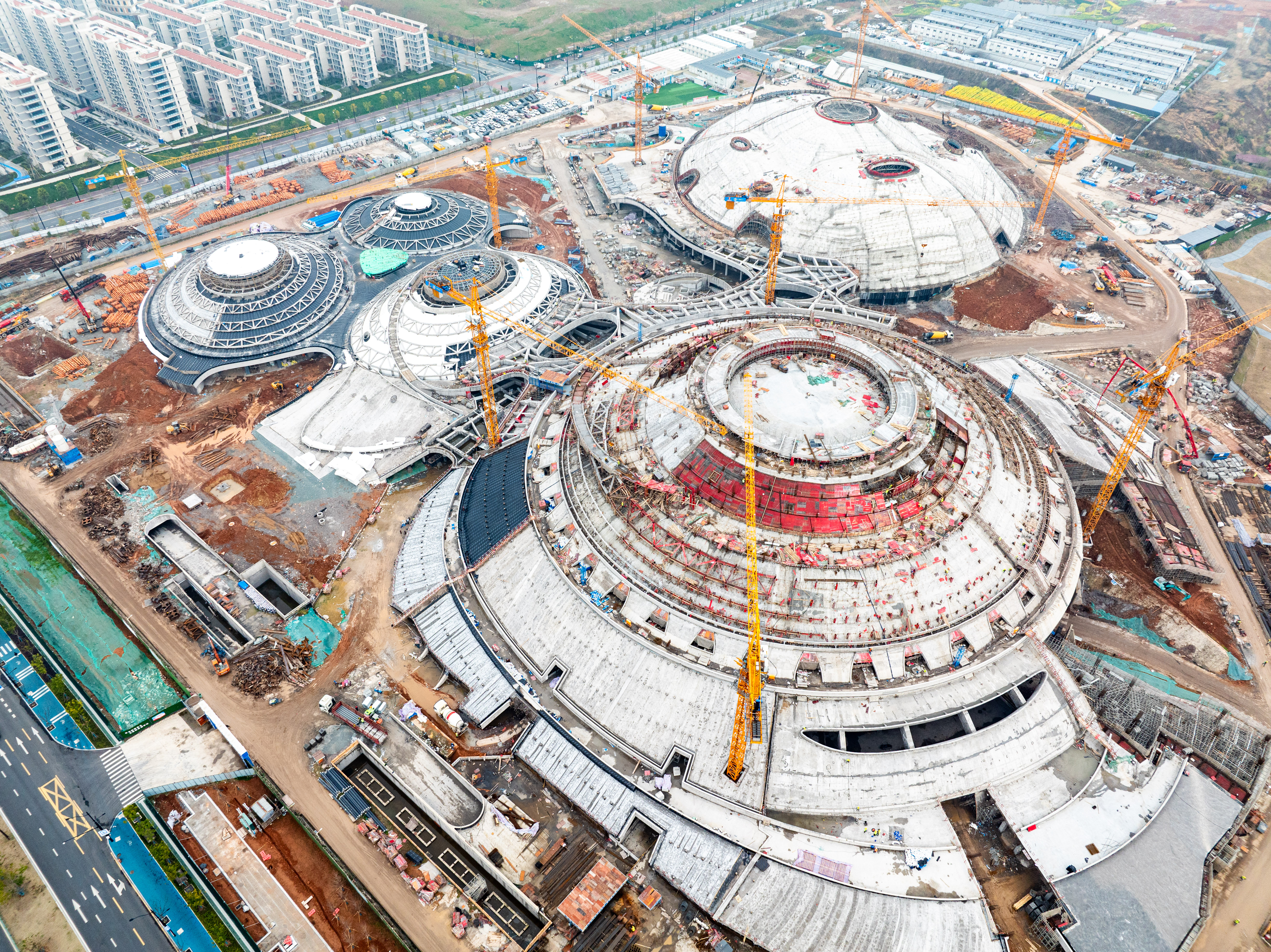 由中國十七冶承建的蘭州奧體中心,采用“飛天花舞”設(shè)計理念,建筑猶如五朵花舞動于絲綢之路上,總建筑面積46.6萬平方米,由60000座玫瑰體育場、8000座郁金香綜合館、3000座百合游泳館、3000座荷花網(wǎng)球館、蘭花運(yùn)動員公寓等單體組成。其中郁金香綜合館弦支穹頂是世界上首個吊掛大噸位斗形屏(40t)的矢跨比小于1/12的90米級大跨度弦支穹頂結(jié)構(gòu)工程。